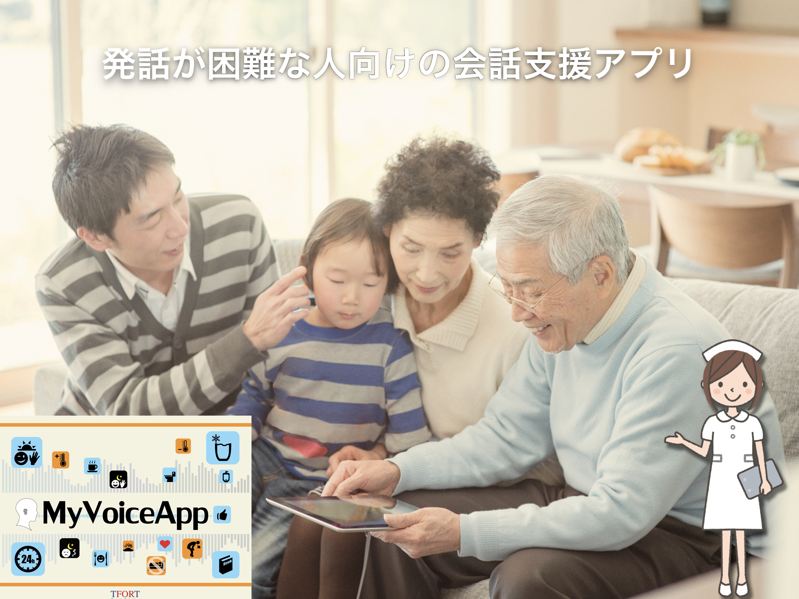 本アプリは兵庫医科大学と共同で研究・開発した、頭頸部癌などの手術により声帯を切除するなどで失声症状となった人たちが、本人の声で会話することの支援を目的としたアプリがベースとなっています。2016年に発売した初期バージョンでは、手術前に録音した本人の声をアイコンを選択するだけで、簡単に発話することを実現しました。しかし、事前に音声を録音することが必要であったため、失声後に本人の声を追加できないこと、また他の理由で発話が困難な人たちは利用できない課題がありました。